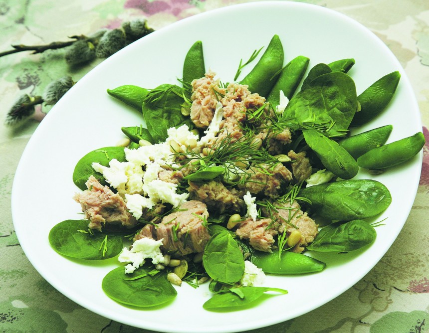Pagatavo mērci: jogurtu sajauc ar sinepēm un citrona sulu, pievieno sāli, cukuru un piparus. Vārītos dārzeņus sajauc ar tunča gabaliņiem un svaigām spinātu lapiņām, pārlej mērci, sausā pannā apgrauzdētām saulespuķu sēkliņām.
