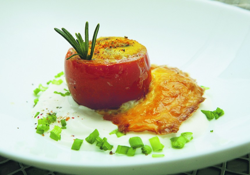 PAGATAVOŠANA: Tomātiem nogriež virsiņas un izdobj vidus. Šampinjonus sagriež šķēlēs vai gabaliņos, sīpolus sasmalcina un sviestā visu apcep. Pievieno sāli, piparus, sasmalcinātus pētersīļu zaļumus. Masu pilda tomātos un virsū katram uzšķiļ pa olai. Pārkaisa sāli, piparus un sezama sēkliņas. Liek iepriekš sakarsētā cepeškrāsnī un 200 grādu temperatūrā cep 15–20 minūtes. Šķīvjos liek pa ēdamkarotei skāba krējuma, virsū – pildītos tomātus. Pasniedz ar svaigu vai grauzdētu maizi.