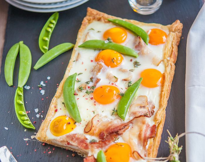 Izceptās mīklas formā liec bekona šķēlītes, pākšu zirņus, pievieno olas.