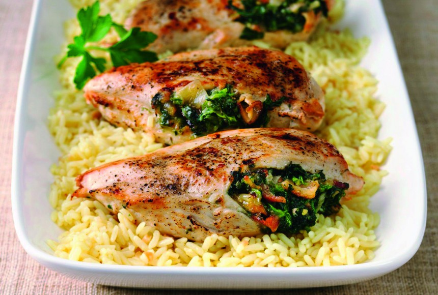 PAGATAVOŠANA: vistu filejas gareniski iegriež. Ķiplokus sasmalcina un sviestā apcep. Pievieno šķēlītēs sagrieztus šampinjonus, visu cep, līdz sula novārījusies, vēl pievieno sviestu, spinātus un pāris minūtes pasautē, pārkaisa sāli un piparus. Pildījumu liek fileju griezumos, ar koka irbulīšiem aizsprauž ciet.