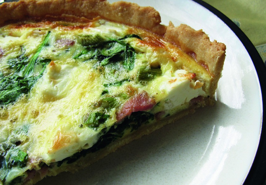 Tad veidnē uz pusceptās mīklas liek biezpienu, kam pievienots nedaudz sāls. Virsū klāj iepriekš savā sulā pāris minūtes pasautētas spinātu lapas (lieko šķidrumu nolej, pievieno sāli, piparus, rīvētu muskatriekstu). Spinātos iespiež ķirštomātiņu pusītes, pārber ar skaidiņās sarīvētu sieru.