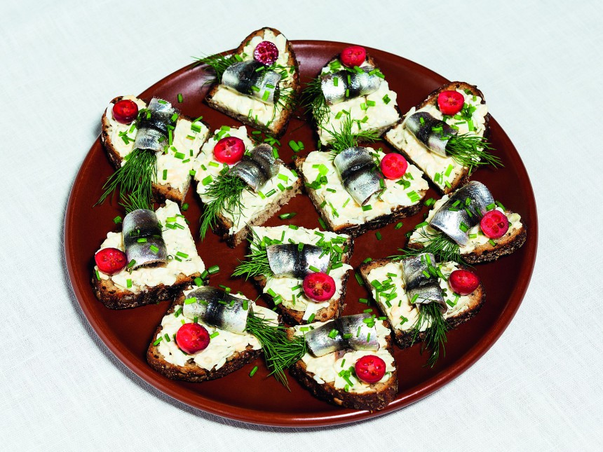 PAGATAVOŠANA: olas izvāra līdz pilnīgai gatavībai, atdzesē un sarīvē uz smalkās rīves. Olām piejauc skābo krējumu, nedaudz sakapātas dilles un sāli. Masu smērē uz maizes šķēlēm. Ķilaviņas atdala no asakām un veido rullīti, kurā ietin diļļu saišķīšus; tos kārto uz maizītēm. Dekorē ar uz pusi pārgrieztām lielogu dzērvenēm.