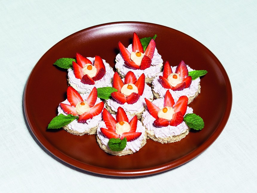 PAGATAVOŠANA: no svaigā siera, cukura un smiltsērkšķu sulas pagatavo viendabīgu masu, visu sajaucot. No graudu maizes ar cepumu formiņu izspiež aplīšus vai kādu citu sev tīkamu figūru. Uz maizes smērē svaigā siera masu. No putukrējuma veido dekoratīvos elementus, piemēram, puķes. Svaigas zemenes sagriež piecās daļās un dekorē. Pārber smiltsērkšķu ogas un pievieno piparmētru lapas svaigumam.