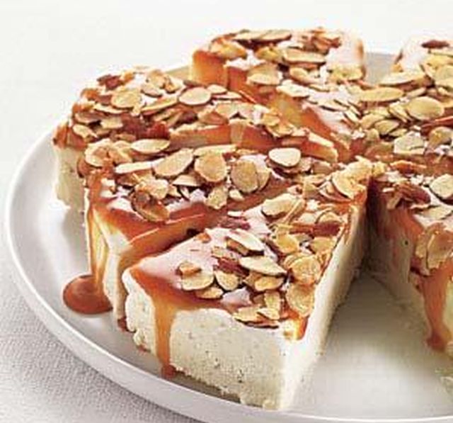 Pagatavošana:Mazliet atlaidiniet saldējumu un tad izspiediet to cepamajā formā. Ielieciet saldētavā uz 10-15 minūtēm, lai tas sastingst. Saldējumam pa virsu uzlejiet karameļu mērci un pārkaisiet ar grauzdētām mandelēm. Ielieciet saldētavā vēl uz vismaz stundu. Pasniedziet uzriez pēc izņemšanas no saldētavas!