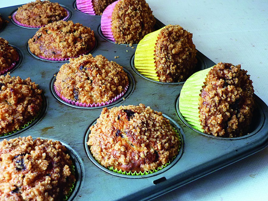 Atsevišķā traukā pagatavo drumstalas: brūno cukuru sajauc ar miltiem, pēc garšas pievieno nedaudz kanēļa, ierīvē cietu sviestu. Visas sastāvdaļas ar pirkstiem saplucina, līdz veidojas birstošas drumstalas. Mafinu pannā liek papīra formiņas, kurās ar karoti liek mīklu (aptuveni 2/3 no kopējā tilpuma, jo cepoties mafini augs). Katram mafinam uzber šķipsniņu drumstalu un liek iepriekš sakarsētā cepeškrāsnī, kur 190 grādu temperatūrā cep aptuveni 20 minūtes, līdz mafini kļūst zeltaini brūni un pufīgi.