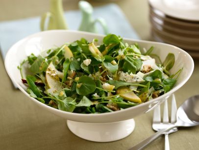 Pagatavošana: Apgrauzdē riekstus cepeškrāsnī un tad sasmalcini tos. Tad atbrīvo rukolu no kātiņiem un ievieto viņu kopā ar spinātiem traukā. Uz salātu lapām kārto plānās šķēlītēs sagrieztu nomizotu bumbieri un kubiciņos sagrieztu zilo sieru. Kad tas darīts sajauc etiķi kopā ar sinepēm, sāli un pipariem, tad lēnām maisot pievieno olīveļļu. Ar iegūto mērci aplej salātus un visbeidzot pievieno sasmalcinātos riekstus.