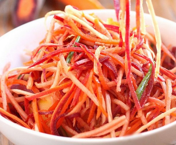 Pagatavošana: Sarīvē burkānus, sagriež ābolu. Sarīvē ingveru. Sagriež sīpolu. Ieliek to visu bļodā un pievieno mandeles. Sagatavo mērci: sajauc etiķi, kļavu sīrupu, olīveļļu. Pievieno sāli un piparus. Laujiet salātiem ievilkties uz brīdi.
