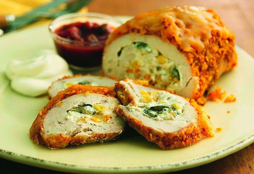Pagatavo marinādi: sāli, piparus, caur ķiploku spiedi izspiestus ķiplokus samaisa ar nelielu daudzumu eļļas. Ar marinādi ierīvē katru filejas gabaliņu un kādu pusstundu atstāj, lai iemarinējas. Spinātus pāris minūtes pavāra, pēc tam notecina lieko šķidrumu un sasmalcina. Sasmalcinātajiem spinātiem pievieno olu, sāli un ķiploku pulveri. Sieru sarīvē. Riekstus sasmalcina.