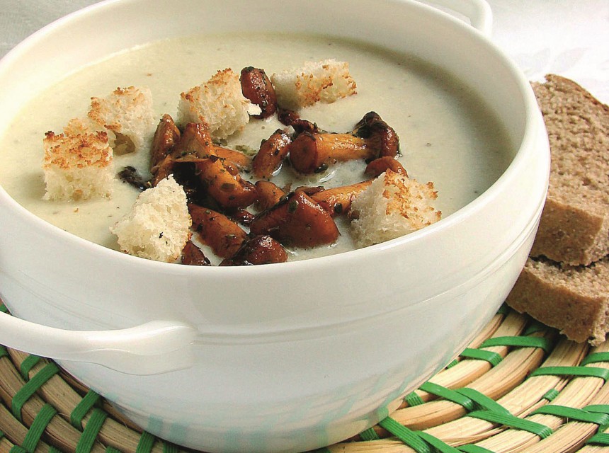 PAGATAVOŠANA: sēnes nomazgā, sīki sakapā, sīpolus malki sagriež, pievieno buljonu, visu liek katlā un vāra 8 – 10 minūtes, līdz sēnes gatavas. Virumu sablenderē, jo gailenes ir diezgan sīkstas. Pannā izkausē sviestu, pievieno miltus, samaisa, pielej pienu. Karsē 5 – 8 minūtes, līdz masa sabiezē. Pievieno sablenderēto gaileņu masu, piparus, sāli. Karsē 9 – 11 minūtes, līdz virums uzmet burbuli. Mazliet atdzesē, sajauc ar saputotu olas dzeltenumu un karsē vēl 1 – 3 minūtes, bet neļauj uzvārīties! Zupu pasniedz karstu.