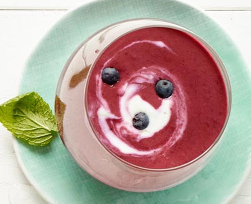 4. Pirms pasniegšanas mellenes salej mazos trauciņos un trauka vidū ieliek pāris tējkarotes grieķu jogurta. Zupu dekorē ar svaigām mellenēm.