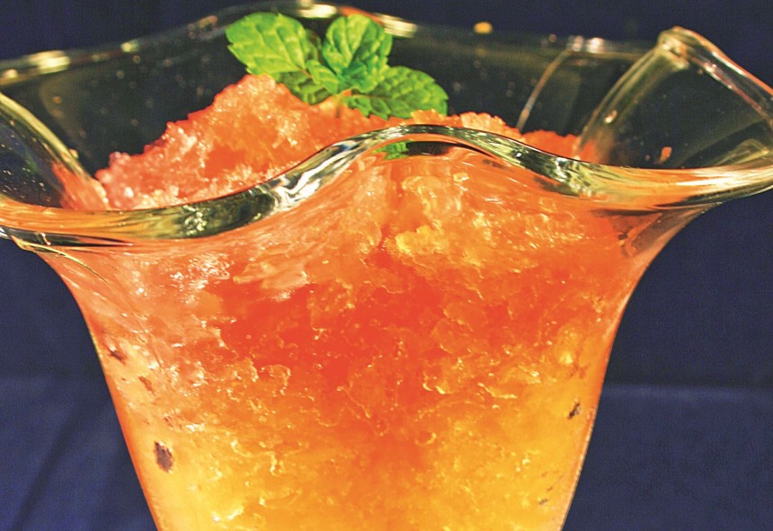 PAGATAVOŠANA: 1/3 daļu baltvīna lej traukā, iemērc piparmētru lapiņas un atstāj divas stundas ievilkties. Pēc tam klāt pielej 2/3 daļas šampanieša un trauku liek saldētavā, ik pa brīdim apmaisot. Kad dzēriens sasalis, to kārto glāzē. Vienā kārtā liek saldēto dzērienu, dēvētu par granitē, otrā kārto augļus. Pirms pasniegšanas pāri lej nedaudz piparmētru liķiera. Rotā ar piparmētru lapiņām.