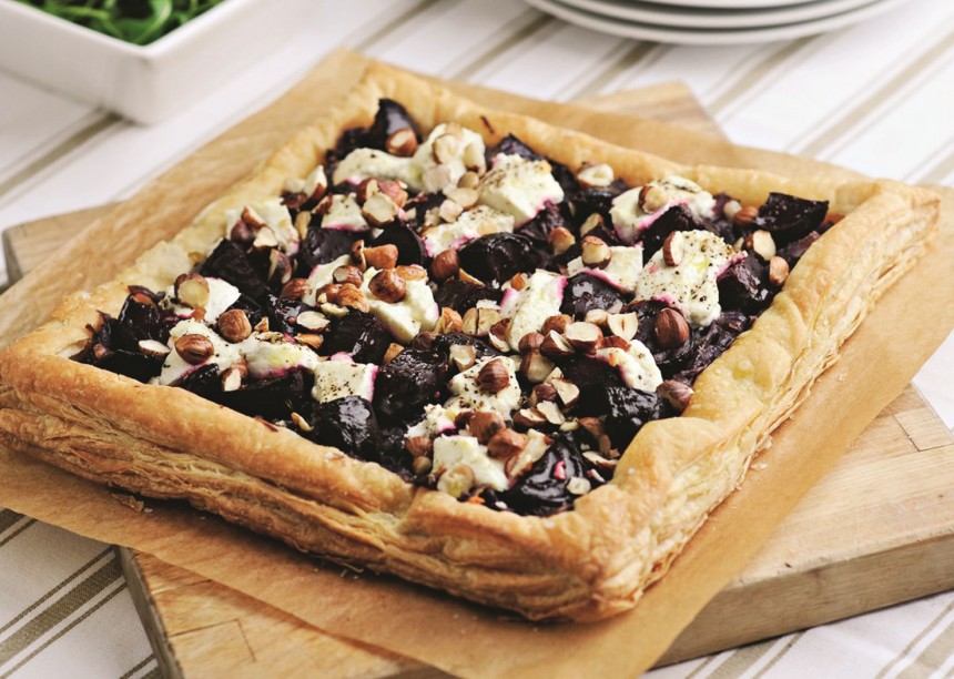 Pagatavošana: atlaidina saldēto mīklu, izvieto taisnstūrveida gabalus uz plāts un sadursta ar dakšiņu. Pannā sakarsē četras ēdamkarotes olīvu eļļas, tajā apcep plānās ripiņās sagrieztus sīpolus. Pievieno divas ēdamkarotes ūdens, sāli un piparus, pannai uzliek vāciņu un uz mazas uguns sautē sīpolus 20 minūtes. Tos liek uz mīklas, virsū liek marinētās bietes, kas sagrieztas salmiņos, uzkaisa sadrupinātu sieru, uzslacina atlikušo olīvu eļļu. Liek cepeškrāsnī 200 grādu temperatūrā, cep 15–20 minūtes. Trīs minūtes pirms cepšanas beigām uzkaisa riekstus. Pasniedz karstu.