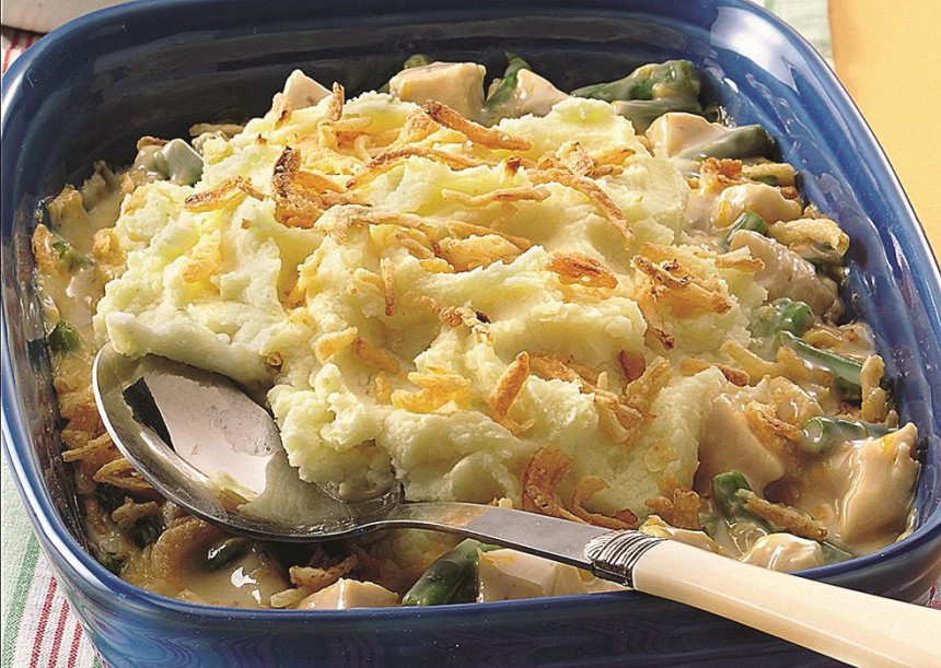 PAGATAVOŠANA: pagatavo aptuveni 800 g kartupeļu biezeņa, tam pievieno sīki sagrieztu, apceptu sīpolu, uzvārītu pienu, olu, sāli, piparus, sasmalcinātus zaļumus, pierīvē muskatriekstu. Kartupeļu masu kārtīgi izmaisa. Novārītās sēnes apcep ar sīpoliem un ķiploku. Ietaukotā veidnē liek kārtu biezeņa, virs tās kārto sēnes, virsū atkal liek kartupeļu biezeņa kārtu. Virsū uzliek dažas piciņas sviesta, pārlej ar skāba krējuma un rīvēta siera maisījumu. Cep cepeškrāsnī, kamēr sacepums atdalās no veidnes malām. Pasniedz siltu.