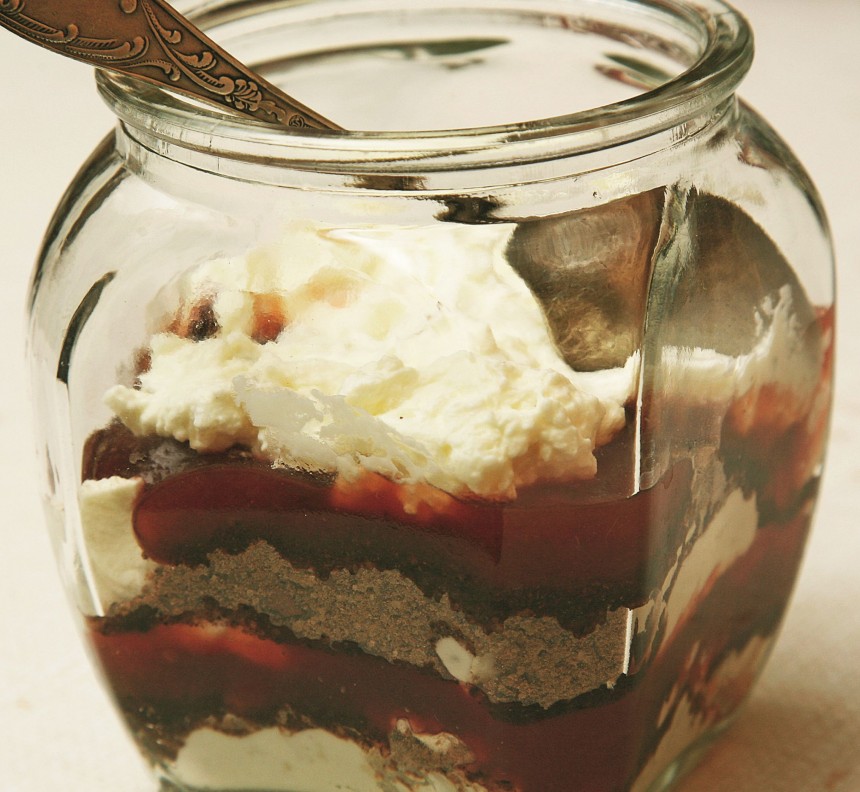 PAGATAVOŠANA: rudzu maizi sadrupina sīkos gabaliņos. Liek sakarsētā cepeškrāsnī 180 grādu temperatūrā un grauzdē 5–10 minūtes. Atdzesē un samaļ. Sakarsētā pannā liek sviestu kopā ar rīvmaizi, apcep un atdzesē.Saldo krējumu saputo ar vienu ēdamkaroti cukura. Pagatavo mērci: saspaida divas saujas dzērveņu un sajauc ar vienu ēdamkaroti cukura. Mērcei pieliek arī dažas veselās dzērvenes. Desertu kārto burciņā, sastāvdaļas liekot kārtās citu virs citas.