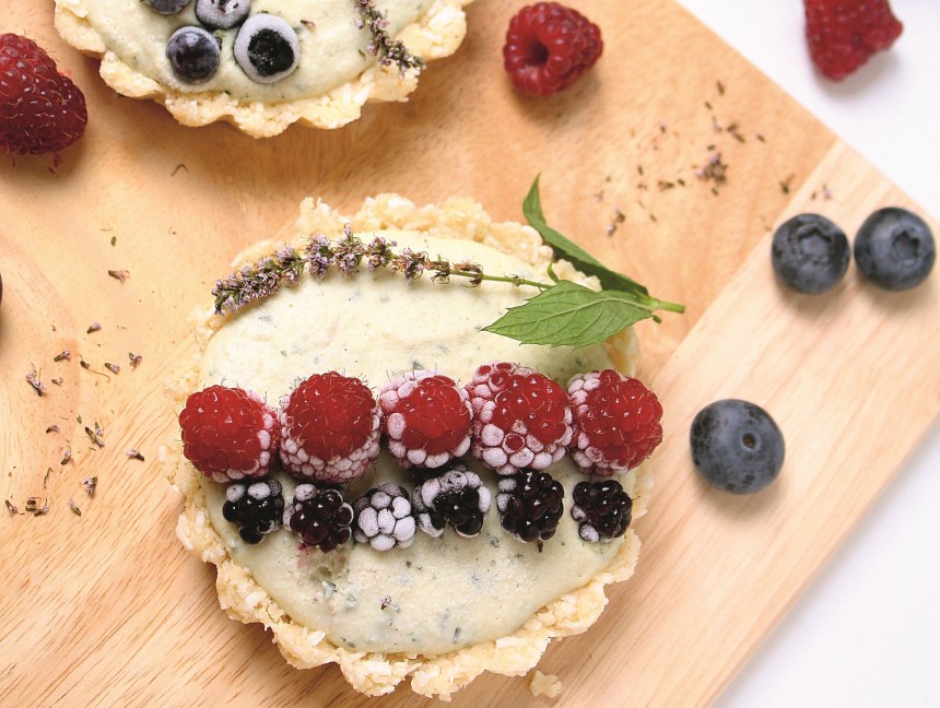 Pagatavošana: visas pamatnes sastāvdaļas kārtīgi samaisa vidēja izmēra bļodā tā, lai veidotos lipīga veidojama masa. Ņem 5 tartīšu formas (vai lielo kūku formu ar noņemamām malām ar 20 centimetru diametru). Masu liek formiņās un izlīdzina ar pirkstiem pa perimetru pēc iespējas vienādā kārtā. Jaudīgā blenderī (var izmantot kafijas dzirnaviņas) ber iekšā riekstus, lej kokosriekstu krēmu, medu vai agaves nektāru, kokosriekstu eļļu un laima sulu. Pievieno piparmētru lapiņas. Blenderē, kamēr iegūta pavisam viendabīga krēmam līdzīga masa, riekstu gabaliņi nedrīkst būt redzami vai jūtami. Pildījumu piecās vienādās daļās lej uz sagatavotās riekstu pamatnes. Dekorē ar ogām un liek saldētavā vismaz uz 3 stundām (lielo kūku uz 4 stundām). Pirms pasniegšanas no saldētavas izņem un patur istabas temperatūrā apmēram pusstundu. Pateicoties pievienotajai kokosriekstu eļļai, kūku kādu brīdi var uzglabāt arī ledusskapī, tā nekusīs, kā kūst saldējums. Pirms pasniegšanas dekorē ar piparmētru lapiņām.