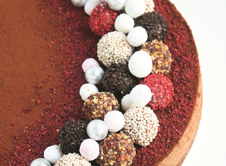 Kūku rotā, pārberot ar kakao (tam var izmantot tējas sietiņu) un dekorējot ar trifelēm un dzērvenēm pūdercukurā.