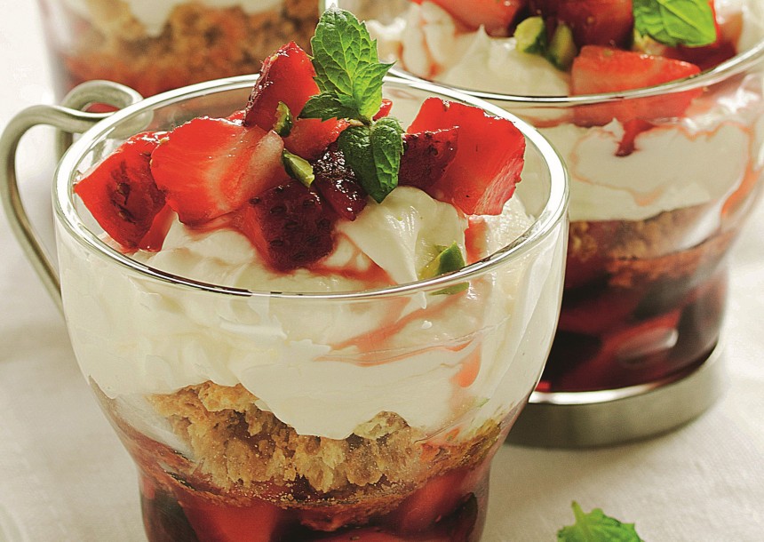 PAGATAVOŠANA: Maskarpones sieru sakuļ ar 100 g cukura, pievieno saldo krējumu un sakuļ vēlreiz. 100 g zemeņu sablendē ar 50 g cukura. Deserta trauciņos liek gabaliņos salauztus cepumus, tos pārklāj ar pusi no sablendētajām zemenēm, pa virsu liek pusi no siera masas. Pa virsu siera masai klāj atlikušos cepumus, tad – sablendētās ogas un atlikušo siera masu. Dažas atlikušās zemenes sagriež šķēlēs vai gareniskās ceturtdaļās, ar tām rotā desertu. Dažas stundas pirms pasniegšanas desertu tur ledusskapī.