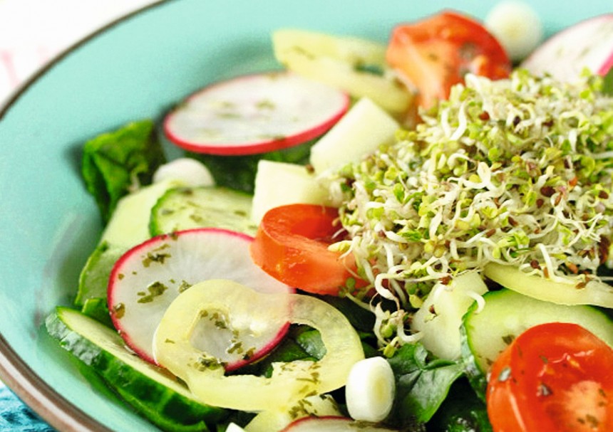 Mērci pārlej salātiem, pa virsu pārkaisa diedzētus asnus.