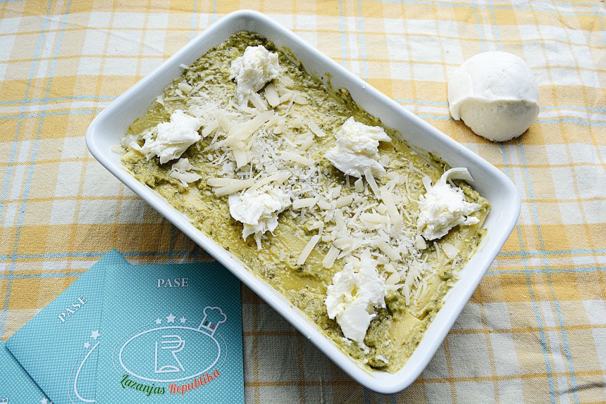 SESTAIS SOLIS: Turpinām likt lazanjas kārtas. Trešā lazanjas kārta atkal būs ar bešamellu un parmezānu, bet ceturtā - ar pesto un mocarellu. Pēdējā, piektā lazanjas kārta ir tā, kas paliks virspusē. Šajā kārtā liekam pesto, mocarellas gabaliņus un pa virsu - rīvēto parmezānu. Šāda lazanja ir gatava cepšanai.