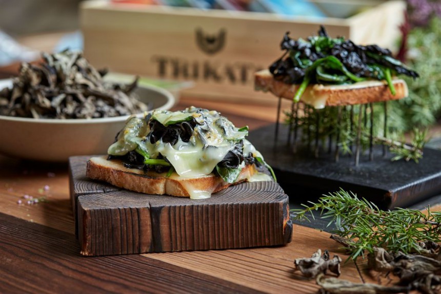 Siermaizīte ar ceptām sēnēm un spinātiem