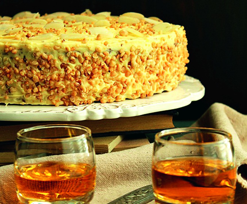 Biskvītus liek vienu virs otra, pa vidu klāj krēma kārtu. Ar krēmu apsmērē arī kūkas malas un augšējo daļu. Kūkas malas dekorē ar biskvīta drupačām, virskārtu - ar drupinātām mandelēm.