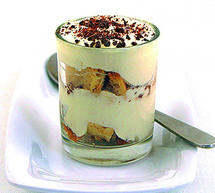 PAGATAVOŠANA: ka biezpiens graudains, to izberž caur sietu, ja sulo - sietā notecina. Biezpienam pievieno maskarponi, rumu vai ruma esenci, pusi no cukura daudzuma, Mokas liķieri, visu saputo viendabīgas konsistences masā un atdzesē. Cepumus pa vienam ātri iemērc aukstā kafijā, kārto veidnē. Cepumiem pāri liek pusi no saputotās masas, pa virsu noklāj vēl vienu cepumu kārtu, virs tās liek banānu šķēlītes un biezpiena-siera masu. Desertu pārkaisa ar kakao pulveri. Tiramisu vairākas stundas atdzesē ledusskapī. Ja gatavo bērniem, desertam alkoholu nepievieno!