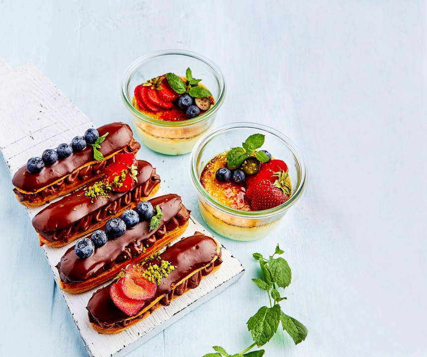 Glazūrai ūdens peldē izkausē šokolādi, pievieno eļļu, samaisa un glazē eklērus. Dekorā liek ogas, pistācijas.