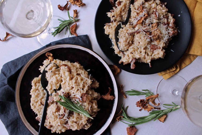 3. Pievieno rīsus, smalki sakapātas rozmarīna lapiņas un apmaisot cep aptuveni vienu minūti, lai rīsi sajaucas ar sviestu. Pielej vīnu un maisot cep, līdz gandrīz viss šķidrums iztvaikojis, bet palikusi burvīgā smarža. Pievieno gailenes un visu samaisa.