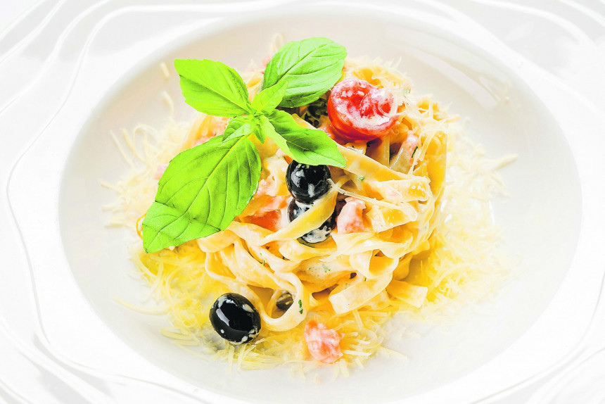 Vakariņas: Spageti ar mērci, ko gatavo no valriekstiem, zaļumiem, siera un augu eļļas.