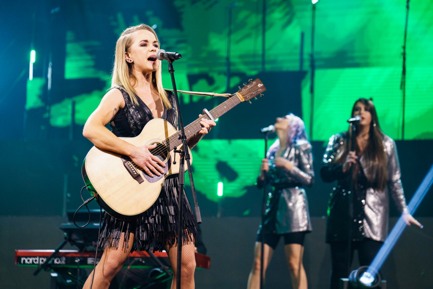Par pārsteigumu dziesmu aptaujas “Muzikālā banka” fināla koncertā Daugavpilī parūpējās dziedātāja Aija Andrejeva – viņa, šķiet, pirmoreiz uz skatuves kāpa ar ģitāru.