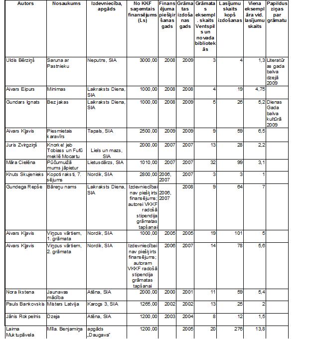 Arī VKKF ir painteresējies par fonda finansēto grāmatu pieprasījumu bibliotēkās. Skaitļi ievērojami atšķiras, ja salīdzina, piemēram, Talsus un Ventspili, ņemot vērā iedzīvotāju skaitu un grāmatu skaitu bibliotēkās, šie skaitļi nerunā par labu Kurzemes latviskākajai pilsētai Talsiem. (Skat. pievienoto tabulu)