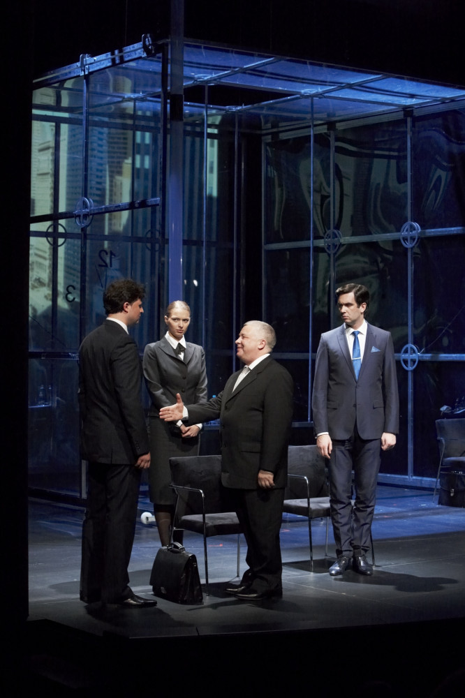 Krievu teātra iestudējuma četrinieka veikums būtu atzīstams par ļoti labu, ja Jevgeņijs Korņevs un Dmitrijs Palēss nepārcenstos ar spēlēšanu uz publiku, jo dažbrīd viegli iebrauc ārišķībā. Precīzāka spēle ar dziļumu izdodas Danai Čerņecovai un Anatolijam Fečinam. Izrādei varētu vēlēties raitāku tempu, jo, stiepjot laiku, ļurkājas ritms un rodas nepārvarama vēlme skatīties pulkstenī. Varētu vēlēties arī jēdzīgāku scenogrāfiju (scenogrāfijas un kostīmu autori Olga Šaišmelašvili un Pjotrs Okuņevs) – esošajos spēles noteikumos organiskā stikla ofisa kastei pašai par sevi nav ne vainas. Taču tā iekarināta trosēs un tiek cilāta, tādējādi gan organizējot izrādes ritmu, taču šajās starpspēlēs arī liekot domāt vien par to, ka tā tiek demonstrētas skatuves jaunās tehniskās iespējas. Tomēr kopumā saturīga izklaide sagaidāma un ofisu ļaudīm – jo īpaši.