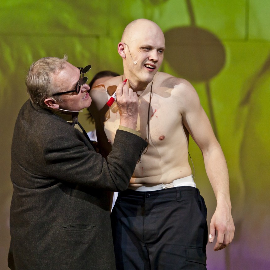 Gundars Grasbergs – aktieris ar vīrišķīgu augumu un bērna labticīgo skatienu – ir īstais rīks Kirila Serebreņņikova rokās. Naivi paļāvīga miera mikas tēls ir maldinošs, tas neiet kopā ar zvēru, kas Voicekā pamostas, un šī disonanse ar acīmredzamā neticamā pavadošo izjūtu ir stabila visu izrādes laiku. Mākslā šādas metamorfozes pelna aplausus, bet dzīvē nākas šausmināties par dendiju Breivīku, kura izrādes kontekstā Šekspīra asiņainās traģēdijas ir bērna šļupsti.