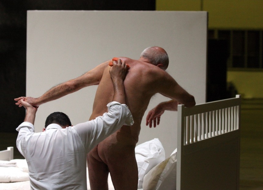 Pirmā izrādes pusstunda dzīves īstenības naturālismā ļauj (vai liek) sekot slima tēva un dēla attiecībām tik prozaiskā situācijā kā nespējīgā tēva caureja un dēla pacietīgā šmuces satīrīšana. Džanni Placi (tēvs) un Serdžio Skarlatellas (dēls) darbs atkailinātās īstenības imitācijā ir apbrīnas cienīgs, īpaši Džanni Placi, kas lielākoties atrodas ar muguru pret skatītājiem, bet pasaka tik daudz – vispirms jau par pazemojumu, nožēlu un par to bezspēcības apziņu, ko uzspiež novecojušā ķermeņa vājums.