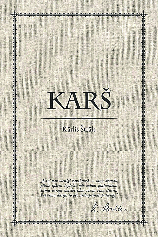 Klasiķa Kārļa Štrāla, kuram pērn novembrī apritēja 135, romāna Karš jauns izdevums. Tajā iekļauta Kārļa Štrāla rakstīta autobiogrāfija, kas šādā apjomā publicēta pirmoreiz, Pirmajam pasaules karam veltītais romāns Karš (visas trīs tā daļas) un pēcvārds Par Karu. Tajā lasāmi romāna izdevējas, rakstnieka mazmeitas Kamenas Kaidakas skaidrojumi, kā arī apkopoti dažādos laikos izteikti vērtējumi par šo klasisko romānu, kas veltīts tiem, kuri, ziedojot savas asinis un dzīvību, izcīnījuši šo valsti. «Autors iznīcina varonības pjedestālus, uz kādiem nezinātājam liekas stāvam ikviens karotājs,» – tā šo romānu raksturo Pirmā pasaules kara dalībnieks Edvarts Virza.