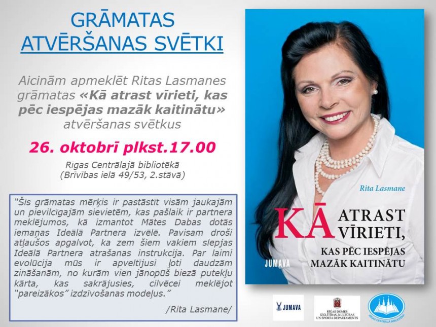 Apgādā “Jumava” iznākusi Ritas Lasmanes padomu grāmata sievietēm “Kā atrast vīrieti, kas pēc iespējas mazāk kaitinātu”.