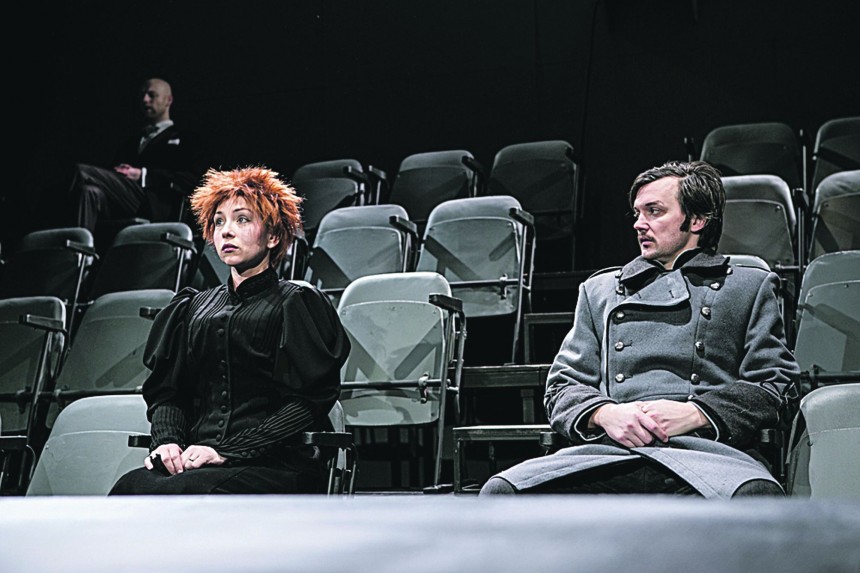 Elmāra Seņkova iestudētā Augusta Strindberga Nāves deja sākas, tiklīdz ieej Valmieras teātrī mazajā zālē. Andra Freiberga scenogrāfija ieved «teātris teātrī» noteikumos, jo šaura skatuves mēle šķir skatītāju zāli no tās spoguļattēla – vairākām krēslu rindām.
