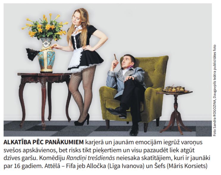 Ceturtdien pulksten 18.30 pirmizrāde Daugavpils teātrī – mūsdienu krievu dramaturga Valentīna Krasnogorova lugas Randiņi trešdienās iestudējums latviešu valodā. Režisors Andrejs Dežonovs (Krievija).