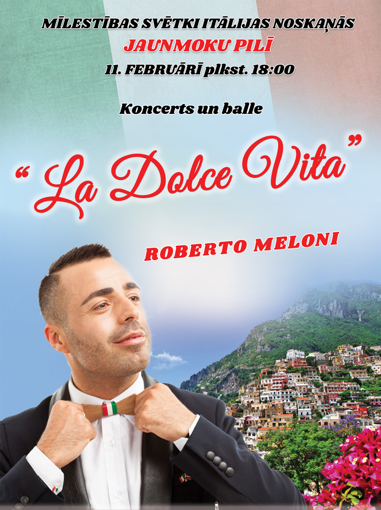 Uz romantiski sirsnīgu vakaru – koncertu un balli – saulainās Itālijas noskaņās 11. februārī 18:00 Jaunmoku pilī aicina harizmātiskais itālis Roberto Meloni. Programmā “La Dolce Vita” (“Saldā dzīve”) pusotras stundas garumā skanēs Domeniko Modunjo „Volare”, Adriano Čelentano „Susanna”, Konsuelo Velaskesa „Besame mucho”, Boba Merila „Mambo Italiano”, dziesmas no paša Roberto repertuāra „Love is Tango”, „Questa Notte”, „Tā esi tu” un citi populāri un tautā iemīļoti skaņdarbi.
