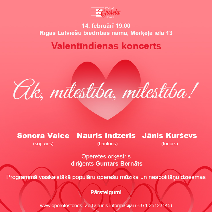 14.februārī jeb visu mīlētāju svētkos – Valentīndienā, kas ne velti tiek dēvēta par gada romantiskāko dienu –, dziedātāji Sonora Vaice, Nauris Indzeris un Jānis Kurševs Rīgas Latviešu biedrības namā notiekošajā Latvijas Operetes fonda rīkotajā dzirkstošajā koncertā priecēs visus, kas sirdī jūtas jauni un mīloši. Koncerta programmā – populāra skaistākā operešu mūzika un neapolitāņu dziesmas par mīlestību: Johana Štrausa, Franča Lehāra, Imres Kalmana, Eduardo di Kapua, Ernesto de Kurtis, Luidži Denzas (Luigi Denza) skaņdarbi. Koncerta sākums – plkst.19.