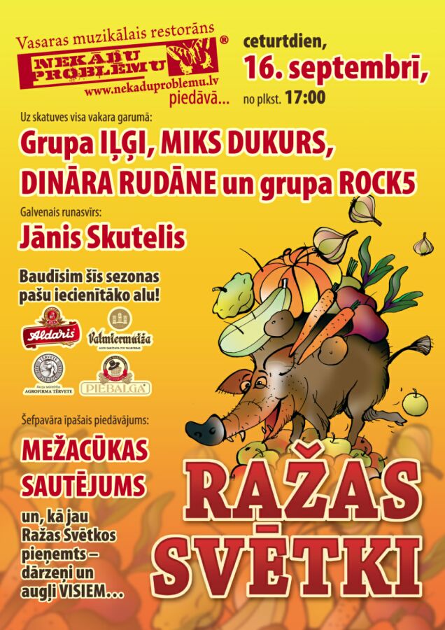 Ražas Svētki restorānā „Nekādu Problēmu” notiks jau otro gadu pēc kārtas un atkal būs tradicionāli zīmīgi ar pavisam īpašu šefpavāra piedāvājumu un krietni paplašinātu muzikālo programmu. Vakara gaitā uz skatuves redzēsim vairākus šīs vasaras sezonas pieprasītākos mūziķus – grupu Iļģi, kas plkst. 17:00 vakaru muzikāli iesāks, Miku Dukuru ar grupu, vakara turpinājumā, un Dināru Rudāni & grupu Rock5, kas uzstāsies Ražas Svētku noslēdzošajā daļā. Pasākumu visa vakara garumā vadīs un „jokus dzīs” Jānis Skutelis.