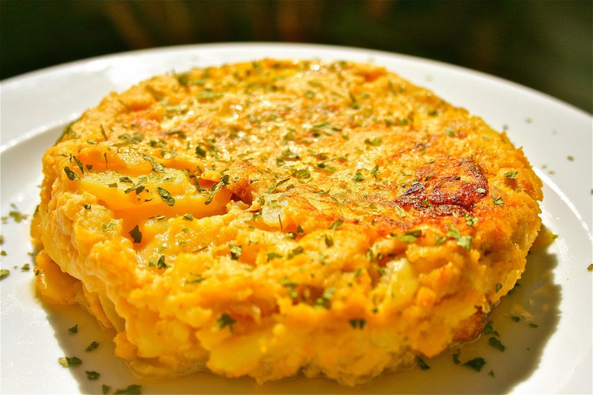 Sastāvdaļas (4 personām). Četri vidēji kartupeļi, 4–5 olas, viens sīpols, 250 ml olīvu eļļas, sāls. Pagatavošana. Kartupeļus nomizo, nomazgā un nosusina, sagriež plānās šķēlītēs, liek dziļā pannā olīvu eļļā uz vidējas uguns, lai lēni cepas. Pievieno sīki sakapātu sīpolu. Turpina lēni cept, līdz kartupeļi kļūst mīksti un lēnām sāk apbrūnēt. Laiku pa laikam apmaisa ar lāpstiņu. Pēc desmit minūtēm nokāš eļļu. Olas sakuļ ar šķipsniņu sāls, pievieno kartupeļiem, pannai uzliek vāku un atstāj uz lēnas uguns 5–10 minūtes. Apcep brūnu no abām pusēm. Pasniedz uz lēzena šķīvja karstu vai aukstu.