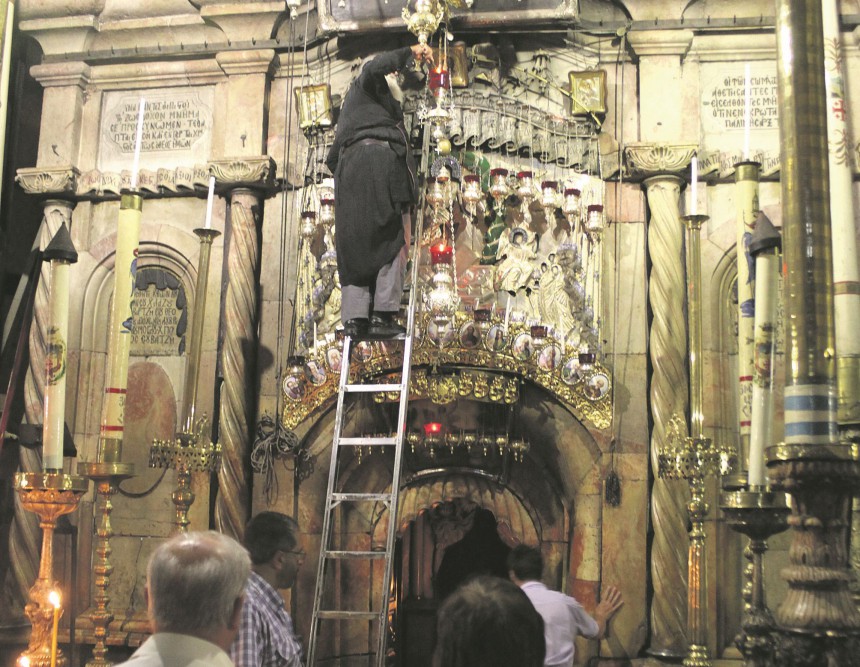 Ar vārdu sakot, kristīgo svēto vīru kautiņi šeit ir parasta lieta - visticamākais, vismaz dažas reizes gada laikā svētie tēvi saķildosies, un reizēm ķīviņš pāraugs pilnasinīgā kautiņā. Visbiežāk tas notiek ap Lieldienām, un parasti krietni daudzskaitlīgākie grieķu pareizticīgo priesteri uzvar katoļus un armēņus, taču arī kopti un etiopieši nav ar pliku roku ņemami.