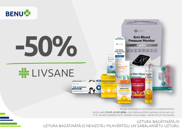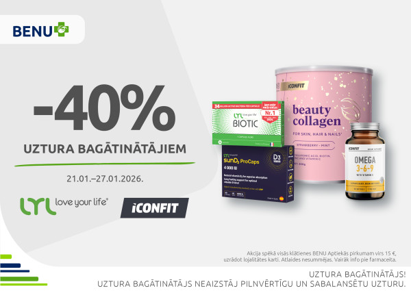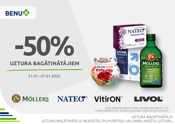Līdz 27. janvārim klātienes BENU Aptiekās lieliskas atlaides uztura bagātinātājiem - līdz pat 50 %! Akcija spēkā pirkumiem virs 15 EUR, uzrādot BENU karti.