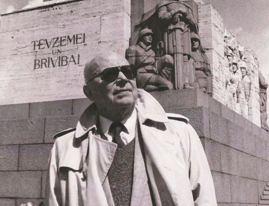 PAR VALSTI. Kad Gunars Janovskis pēc garajiem trimdas gadiem beidzot viesojās dzimtenē, mūsu fotomeistari uzskatīja par nepieciešamu viņu bildēt pie Brīvības pieminekļa. Šajos uzņēmumos nenoliedzami bija kas simbolisks, jo rakstnieka romāniem tiešām piemīt liela ticība Latvijai. Šīs fotogrāfijas autors ir Jāzeps Danovskis, fotomākslinieks, kura plašā rakstnieku fotoarhīva pēdas ir pagaisušas 2000. gadu sākumā © no Arno JUNDZES personiskā arhīva