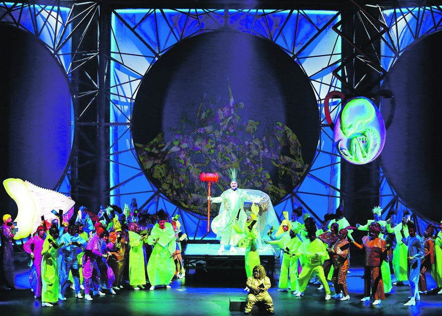 Izrādes vizuālajā tēlā sajūsmina Didža Jaunzema radošais telpiskums un pārsteidzošās dinamiskās transformācijas (sevišķi no baloniem izveidotā milzu Venera bordeļa skatā), izmantojot vienkāršas formas - kvadrātu, apli, kā arī konstrukcijas un mehānismi. Scenogrāfijas melnbaltums pret krāsainajiem Yashi kostīmiem, frizūrām un grimu veido kontrastus, kas neļauj atslābt skatītāja uzmanībai, savukārt -8 videoprojekcijas piešķir iestudējumam videoklipa dinamiku, koķetējot ar digimodernisma nepielūdzamo klātbūtni mūsdienu sabiedrības ikdienā. Jaudīga, bet ne līdz galam pamatota ir ideja par cilvēku klonēšanas mašīnu kā lielummānijas personifikāciju un milzīgās baltās galvas ar metāla spirāles balstiem. Tas sasaucas ar nupat jau biedējoši bieži arī reālajā dzīvē izskanošajām idejām par robotu armijām, taču ir pretrunā ar tekstu, kur runāts par akmeņu pārvēršanu maizē, lai pabarotu izsalkušos.