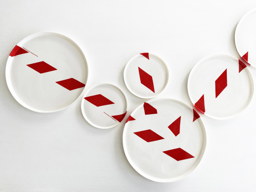 Porcelāna trauku autore Astra Šēnberga: “Trauku komplekts Aizliegtais auglis veidots lakoniskā stilā, ļaujot brīdinājuma lentas motīvam paust savu stāstu par dzīvi pandēmijas laikā.”