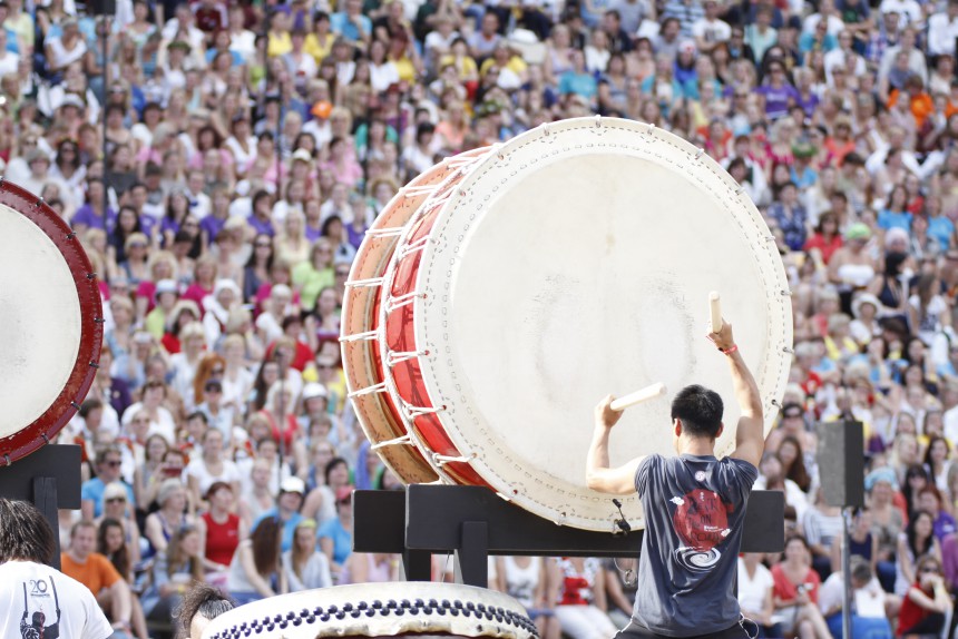 Dziesmusvētku estrādē mutuļoja dažādi tērpi, melodijas, dejas, dziesmas. 5000 dalībnieku elpoja vienā ritmā – mūzikas un ritma gaisotnē. Savu toni tam uzdeva arī Japānas bungu grupa Yamato, drummers of Japan.