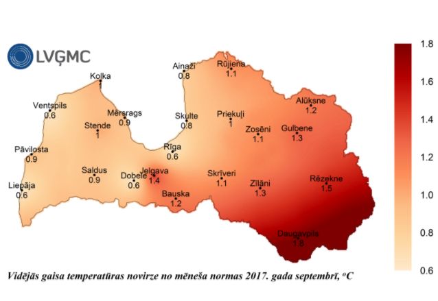 Septembra mēneša vidējā gaisa temperatūra Latvijā bija +12,8oC, kas ir 1,1oC virs mēneša normas. Mēneša minimālā gaisa temperatūra -0,2oC 29. septembrī tika novērota Zosēnos, bet maksimālā gaisa temperatūra +23,8oC – 10. septembrī Zīlānos. Septembris ir pirmais mēnesis kopš marta, kurā mēneša un visu dekāžu vidējā gaisa temperatūra ir augstāka par normu, ziņo Latvijas Vides, ģeoloģijas un meteoroloģijas centrs.