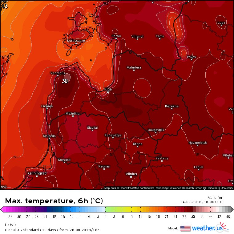 Sinoptiķis Jānis Trallis mikroblogošanas vietnē Twitter dalījies ar ekrānšāviņu, kurā GFS otrdien, 4. septembrī, prognozē pat +30 grādu lielu karstumu. "Tas tik būtu vareni, ja piepildītos GFS prognoze par +30 grādiem nākamnedēļ. Visi modeļi prognozē siltumu, bet GFS laikam ir vienīgais, kas dod tik daudz. Turklāt relatīvi īsās dienas un mitrais gaiss nozīmē, ka mākoņi viegli var pazemināt dienas maksimālo temperatūru," norāda Trallis.